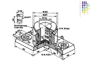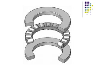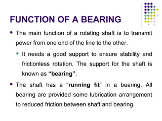 Bearings support rotating shafts and allow them to rotate with minimal friction. There are two main types: plain/slider bearings where the shaft slides against the bearing, and rolling element bearings like ball or roller bearings where balls or rollers allow the shaft and bearing to roll against each other with lower friction. Rolling element bearings have lower starting torque needs and friction compared to plain bearings. Journal, footstep, and thrust bearings are types of plain bearings that support axial or radial loads on vertical or horizontal shafts. Proper lubrication is important for all bearing types to reduce friction.