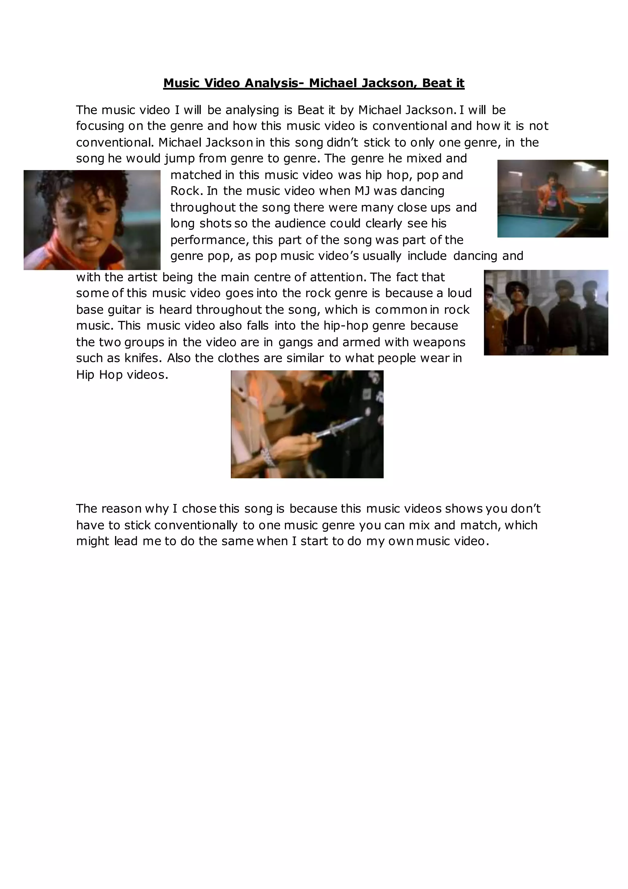 Michael Jackson's music video for "Beat It" mixes genres by incorporating elements of hip hop, pop, and rock. It has pop elements like dancing focused on MJ's performance. Rock elements include loud bass guitar. Hip hop elements include depictions of gangs armed with knives and clothes resembling hip hop fashion. The video demonstrates that music videos don't have to stick to one genre conventionally, but can mix genres, which inspired the author to also take a non-conventional approach by blending genres in their own music videos.
