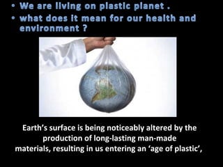 This presentation discusses the growing issue of plastic pollution and its effects on the environment. It notes that human civilization has progressed through Stone, Bronze, and Iron Ages, and are now in the Plastic Age. Plastic is widely used for various domestic, medical, agricultural, and industrial purposes. However, plastic waste pollutes the lithosphere, hydrosphere, and atmosphere. Microplastics in particular enter the oceans and aquatic food chains, threatening biodiversity. Burning plastic releases toxic gases that pollute air and contribute to climate change. Potential solutions discussed include banning certain plastics, promoting bioplastics and alternative materials, and developing plastic-degrading enzymes.