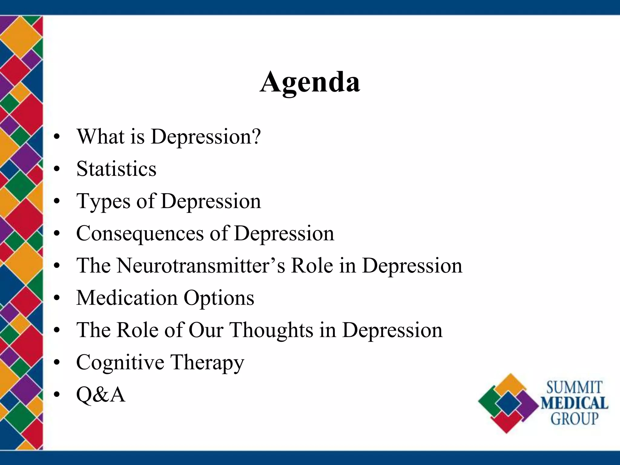 The document presents an overview of depression, including its definition, types, statistics, and treatment options. It emphasizes the prevalence of depression among adults, the importance of seeking treatment, and various therapies such as cognitive behavioral therapy (CBT) and medication options. Additionally, it outlines risk factors, consequences of untreated depression, and alternative interventions like bright light therapy and transcranial magnetic stimulation.