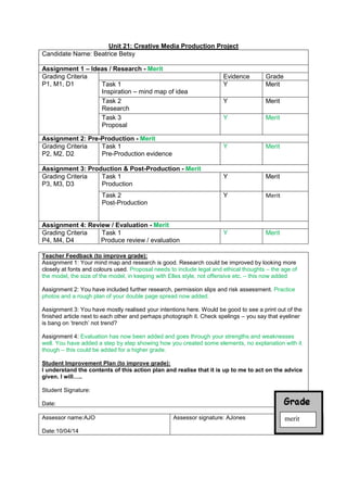 Beatrice Betsy received a merit grade for her creative media production project consisting of four assignments. The assessor provided feedback on ways Beatrice could improve her work for a higher grade. For Assignment 1, researching fonts and colors more closely and including legal and ethical considerations in the proposal were suggested. For Assignment 2, including practice photos and a plan were added. For Assignment 3, printing the finished article together and checking spellings were advised. For Assignment 4, adding an explanation to the step-by-step was recommended. Beatrice signed an improvement plan agreeing to act on the assessor's advice to improve her grade.