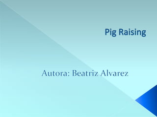 The document provides information about pigs, including their classifications (female sow, male gilt, boar, hog) and living conditions (barns, pig pens). It also discusses health issues and diseases that affect pigs, such as skin worms, lice, and malnutrition. Additionally, it includes links to various resources related to pig farming and meat production.