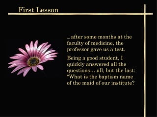 The document shares three short lessons. The first is about showing kindness and attention to others regardless of their status. The second is about helping others in need, as a man helped a woman whose car broke down late at night. The third is about a boy who chose a simple ice cream over a more expensive Sundae so he could leave a tip for the waitress. The document encourages the reader to appreciate what they have and brighten others' days with kindness.