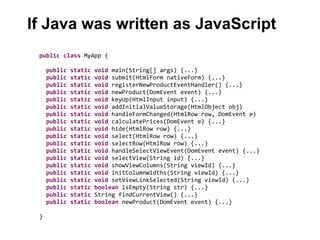 This document discusses how JavaScript code would look if Java was written in JavaScript. It provides examples of Java-like classes and methods written in JavaScript. It also discusses JavaScript design patterns like the Module pattern and MVC frameworks. Finally, it covers topics like unit testing JavaScript with Jasmine, SVG vs Canvas for graphs, and libraries like Underscore.js and CSS frameworks.