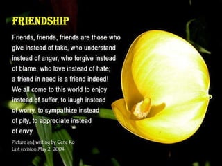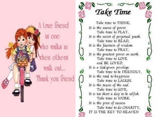 The document is a message to a friend checking in on their well-being and expressing care, love, and friendship. It includes acronyms to ask how the friend is doing and if everything is alright. It believes in the power of prayer and includes prayers for peace and trust. It also shares quotes and thoughts about the blessings of faith, strength, and friendship even during difficult times. The message concludes by thanking the friend for watching.