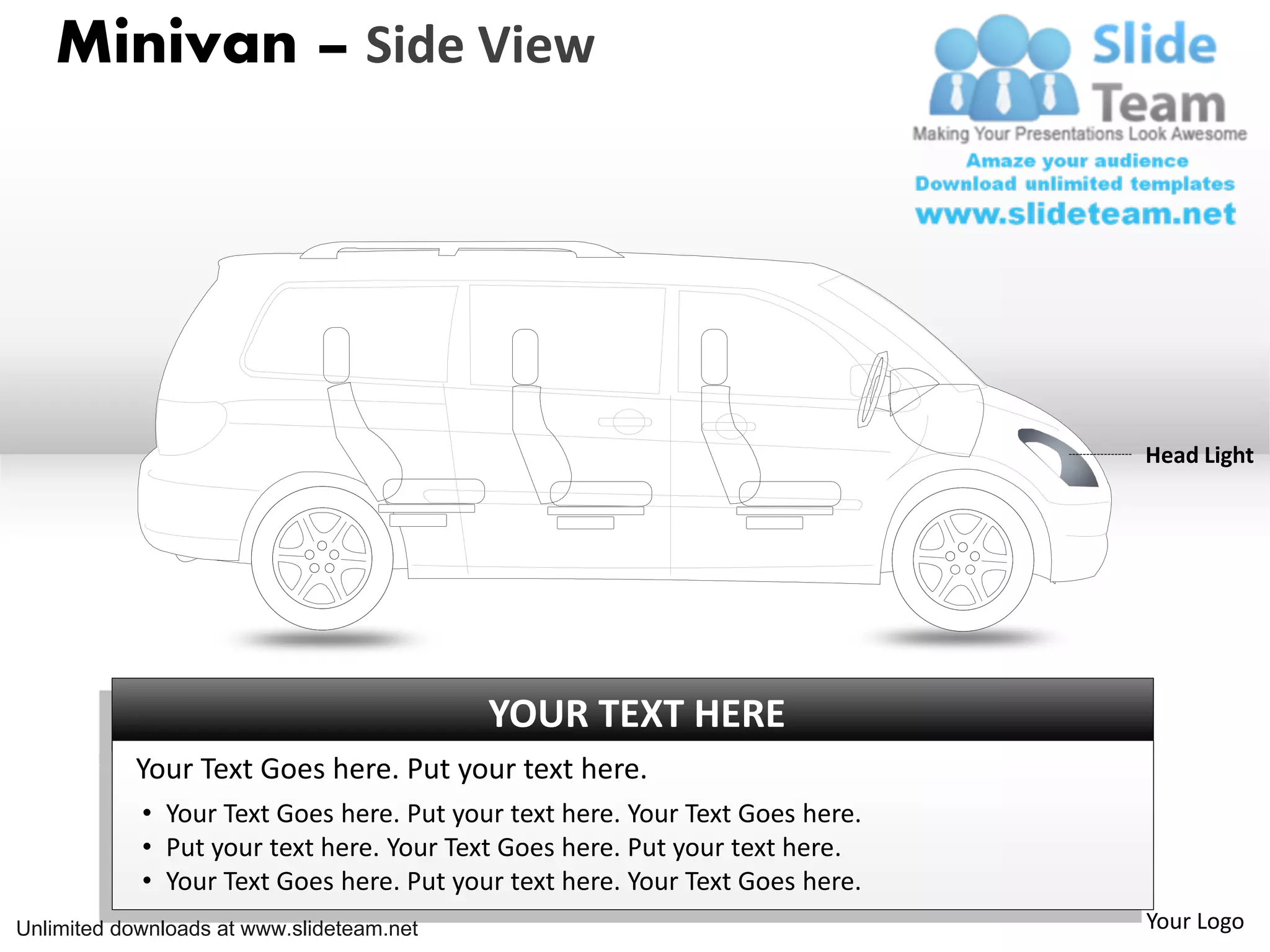 The document shows a side view diagram of a minivan with labels for the key parts. It includes a headlight at the front and does not show any additional details. The summary focuses on the high-level content that the document contains a basic labeled diagram of the side view of a minivan.