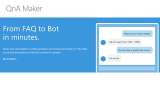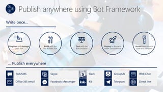 This document summarizes several Microsoft Cognitive Services including Language Understanding (LUIS), Speaker Recognition, Computer Vision, and Bing Search. LUIS allows developers to build models that understand natural language and add conversational capabilities to applications. Speaker Recognition recognizes who is speaking. Computer Vision analyzes images to extract objects and information. Bing Search enables intelligent search over data or the web. These services leverage AI technologies from Microsoft to add human-like capabilities to applications.