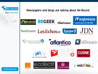 Be-Bound provides a solution allowing users to connect to the mobile internet anywhere in the world using SMS, even without 3G or WiFi access. The document lists numerous press articles from blogs and newspapers discussing Be-Bound's participation and recognition at the LeWeb 2012 startup competition in Paris. Be-Bound also received press coverage from business wire and other press release sites announcing the launch of their new solution.