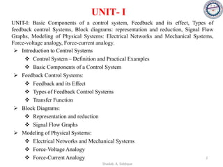 This document provides an overview of control systems including definitions, types, components, and their classifications such as open loop and closed loop systems. It also discusses the feedback mechanism, the role of various elements like controllers and plants, and the significance of modeling physical systems. The course aims to equip students with skills to analyze and differentiate between different control system responses and characteristics.