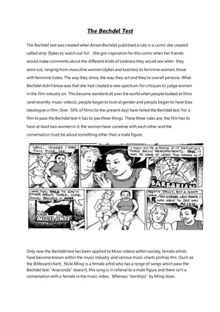 The Bechdel Test, created by Alison Bechdel, evaluates whether a film features at least two women who talk to each other about something other than a male figure, with over 50% of films failing this test. Recently, the test has also been applied to music videos, with examples like Nicki Minaj's 'Starships' failing and 'Girl on Fire' by Alicia Keys passing. The test highlights gender representation in media and encourages a deeper exploration of women's roles in both film and music.