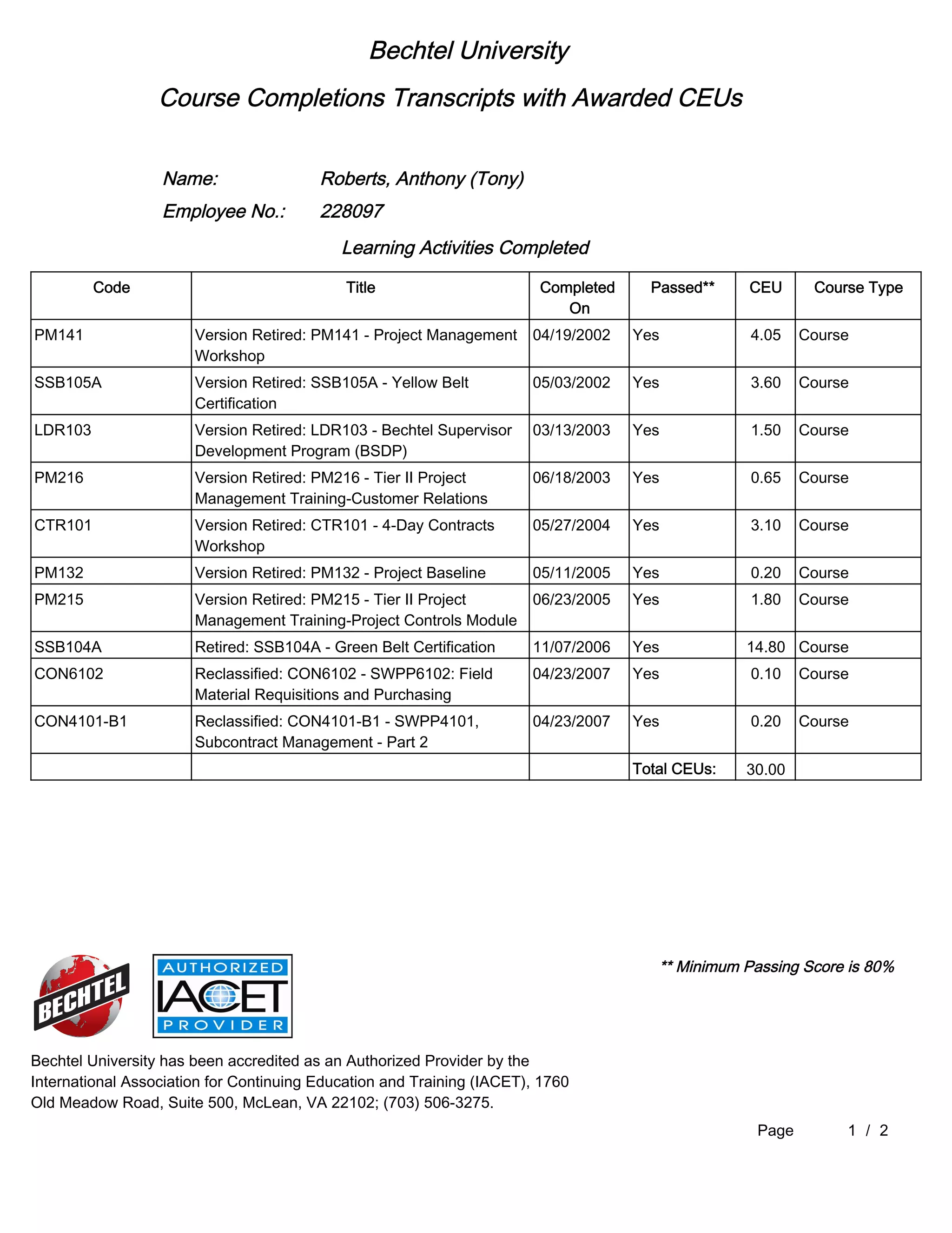 The document details the course completions and awarded CEUs for an employee, Anthony Roberts, at Bechtel University. It lists various courses completed, their completion dates, and the corresponding CEUs earned, totaling 31.55 CEUs. Bechtel University is accredited by the International Association for Continuing Education and Training (IACET).