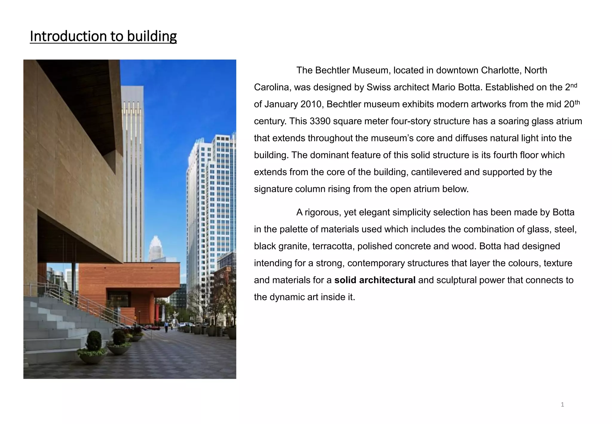 This document provides details on the construction of the Bechtler Museum building in Charlotte, North Carolina. It was designed by Swiss architect Mario Botta and features a soaring glass atrium. The dominant feature is the cantilevered fourth floor, supported by steel beams and a signature column. Materials used include glass, steel, granite, concrete, and terracotta tile cladding. Orthographic drawings and sections show the building plans and structural systems, including the composite concrete slabs, steel beams, and load distributions supporting the cantilever. Construction details are provided for the skylight, terracotta cladding, walls, and load-bearing column.