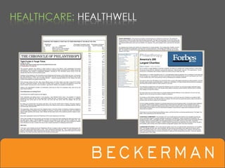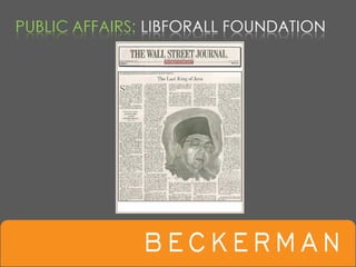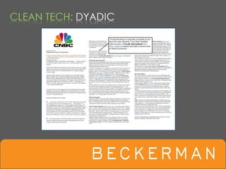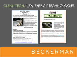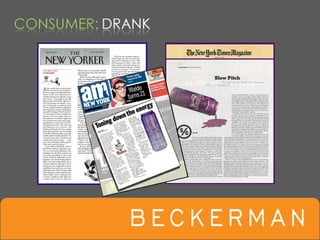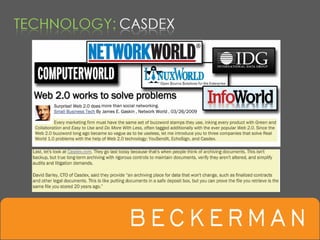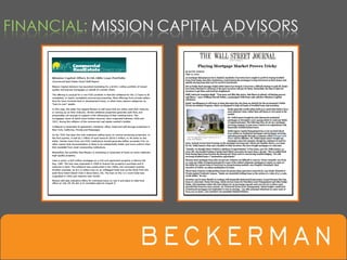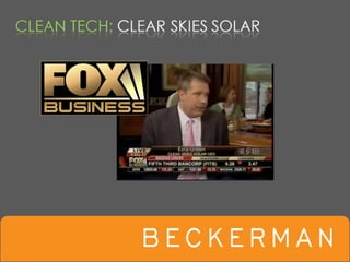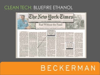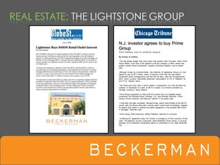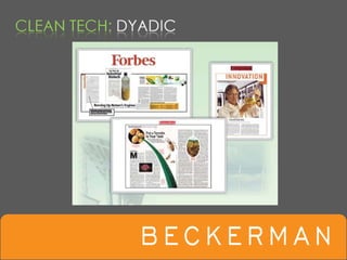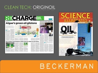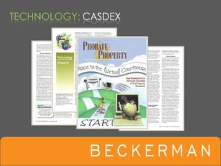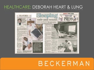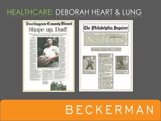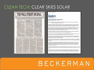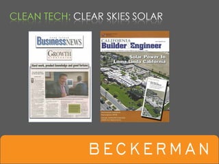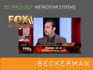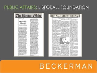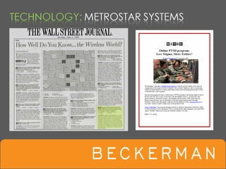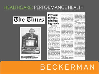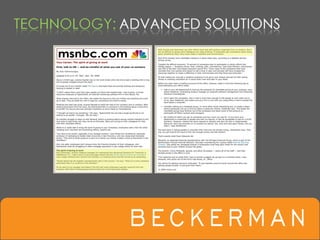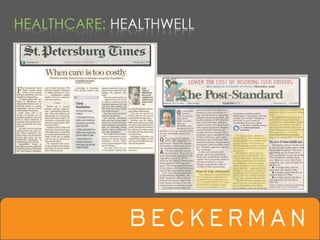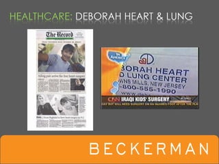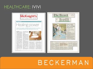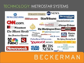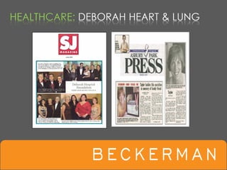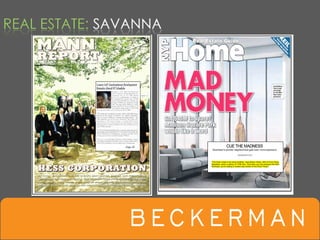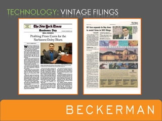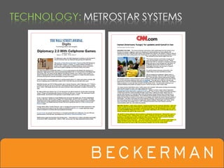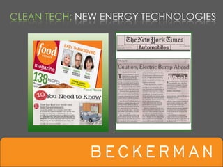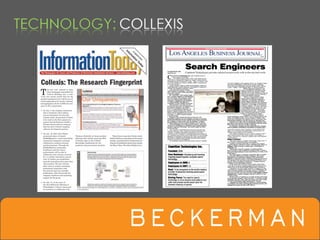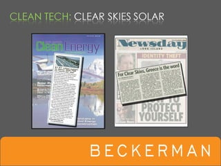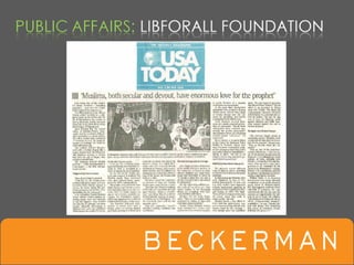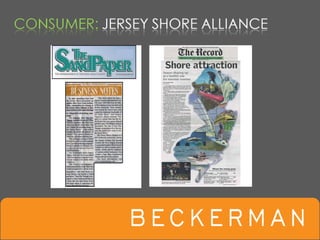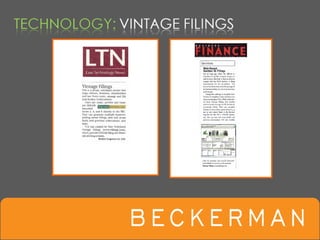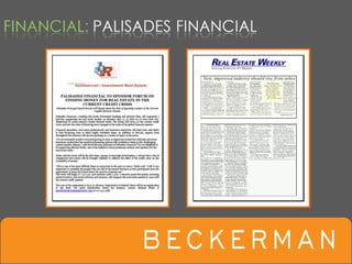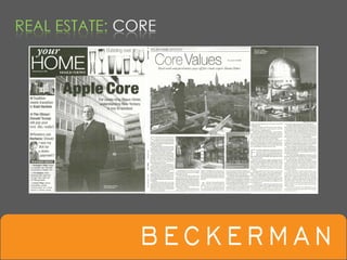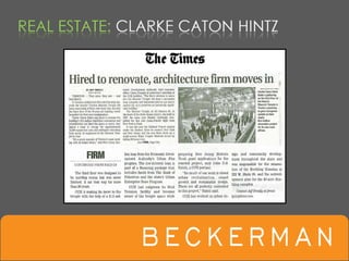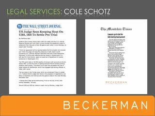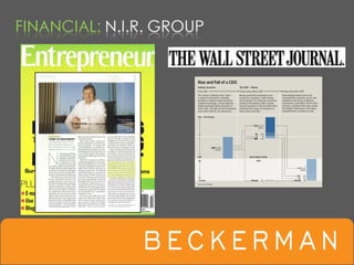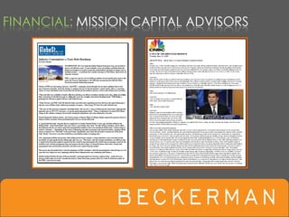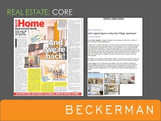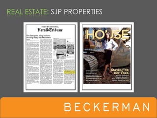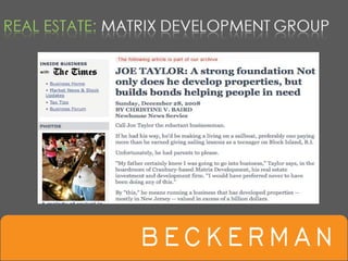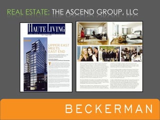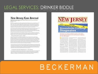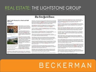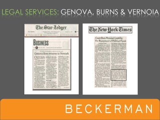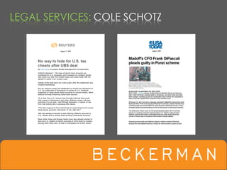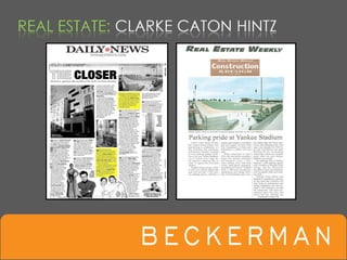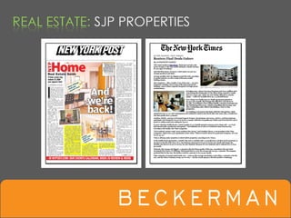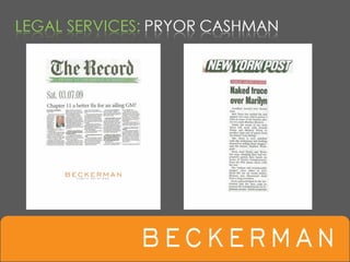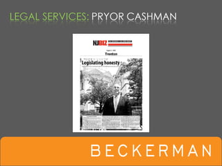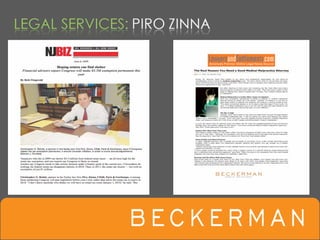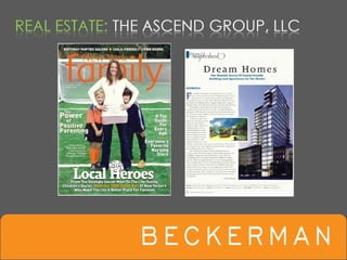 Beckerman Public Relations is one of the largest independent public relations firms in New York and New Jersey, employing over 35 media specialists. It has successfully promoted several law firms, financial services companies, and real estate developers by positioning their executives as experts, securing prominent media coverage, and developing strategic communications campaigns. Beckerman's clients span various industries and its specialists have expertise in legal, real estate, financial, technology, and healthcare public relations.