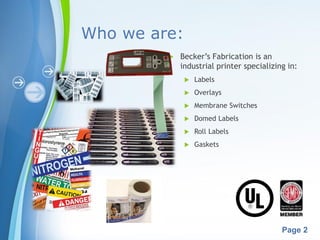 Becker's Fabrication is an industrial printing company based in Yorba Linda, CA, specializing in custom labels and overlays with a focus on quality and flexibility. The company operates from a 14,000 square foot facility with a strong ISO9002 modeled quality assurance system, leading to high customer satisfaction and low return rates. They utilize various printing technologies and maintain a skilled workforce dedicated to meeting customer needs efficiently.