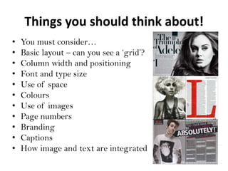 This document analyzes and compares several double page spreads. It discusses elements like layout, use of images, colors, font, and space usage. Overall assessments are provided for each spread, noting what elements work well and could be improved. Some spreads use clear, interesting photos and fonts that are easy to read. Others are said to have boring, low quality photos and colors that don't blend well. The masthead, text size, and balance of elements vary across spreads, with some being more eye-catching and professionally designed than others.
