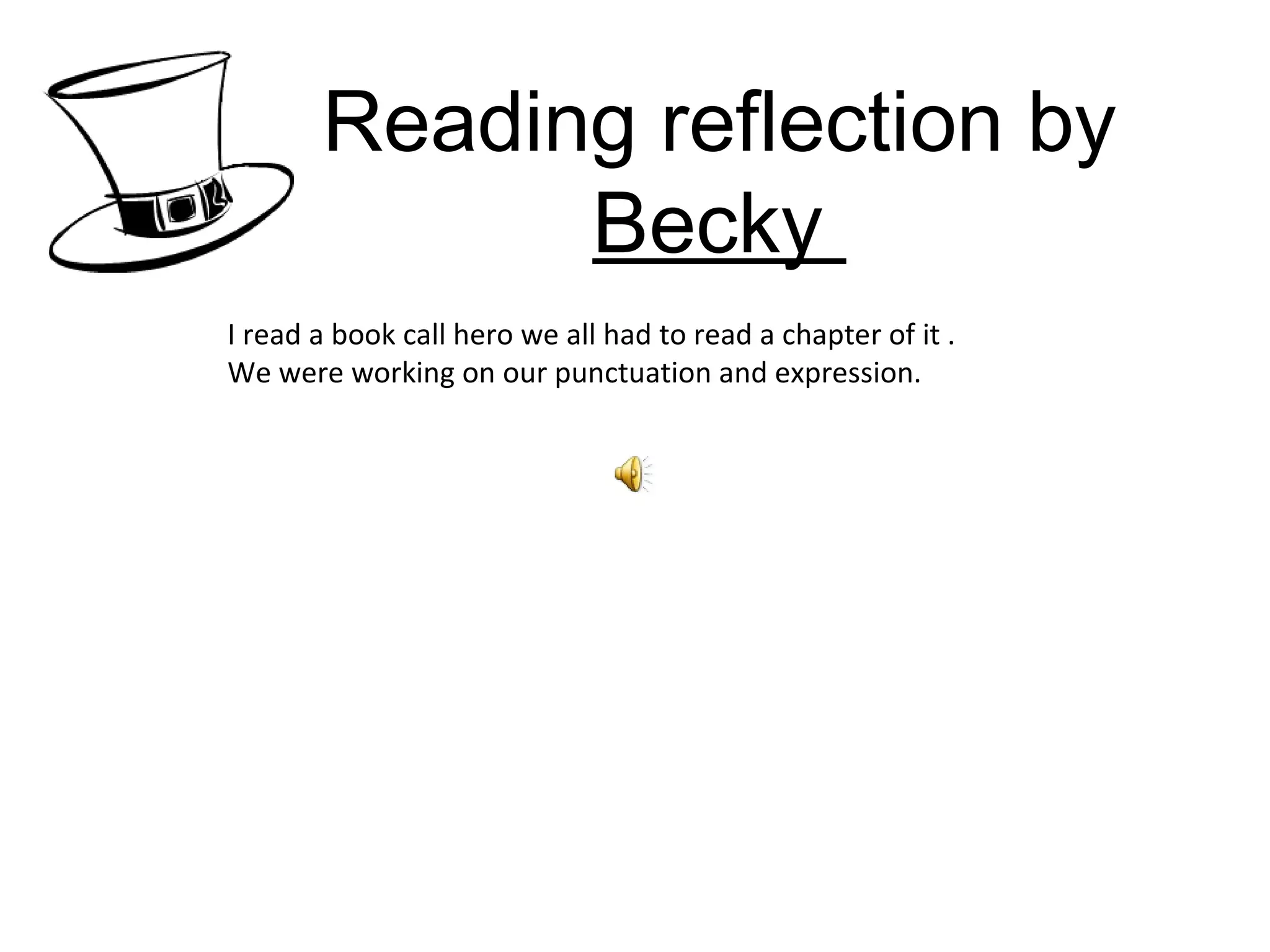 Becky read a chapter from a book her class was assigned and had to record herself reading aloud. She felt nervous reading into a microphone but thought it was good to listen to her own reading to identify mistakes. In her reflection, Becky noted she needs to work on speaking more slowly, using better expression, pausing at punctuation marks, speaking louder and more clearly. She plans to practice these skills at home and school.