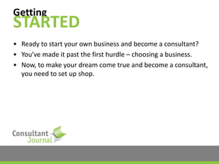 This document outlines steps for becoming a consultant, starting with assessing personal suitability and identifying a consulting field based on skills and experience. It emphasizes the importance of creating a comprehensive business plan, which should cover business setup, environment, marketing, operations, and finances. Additionally, it offers resources for further assistance in launching and growing a consulting business.