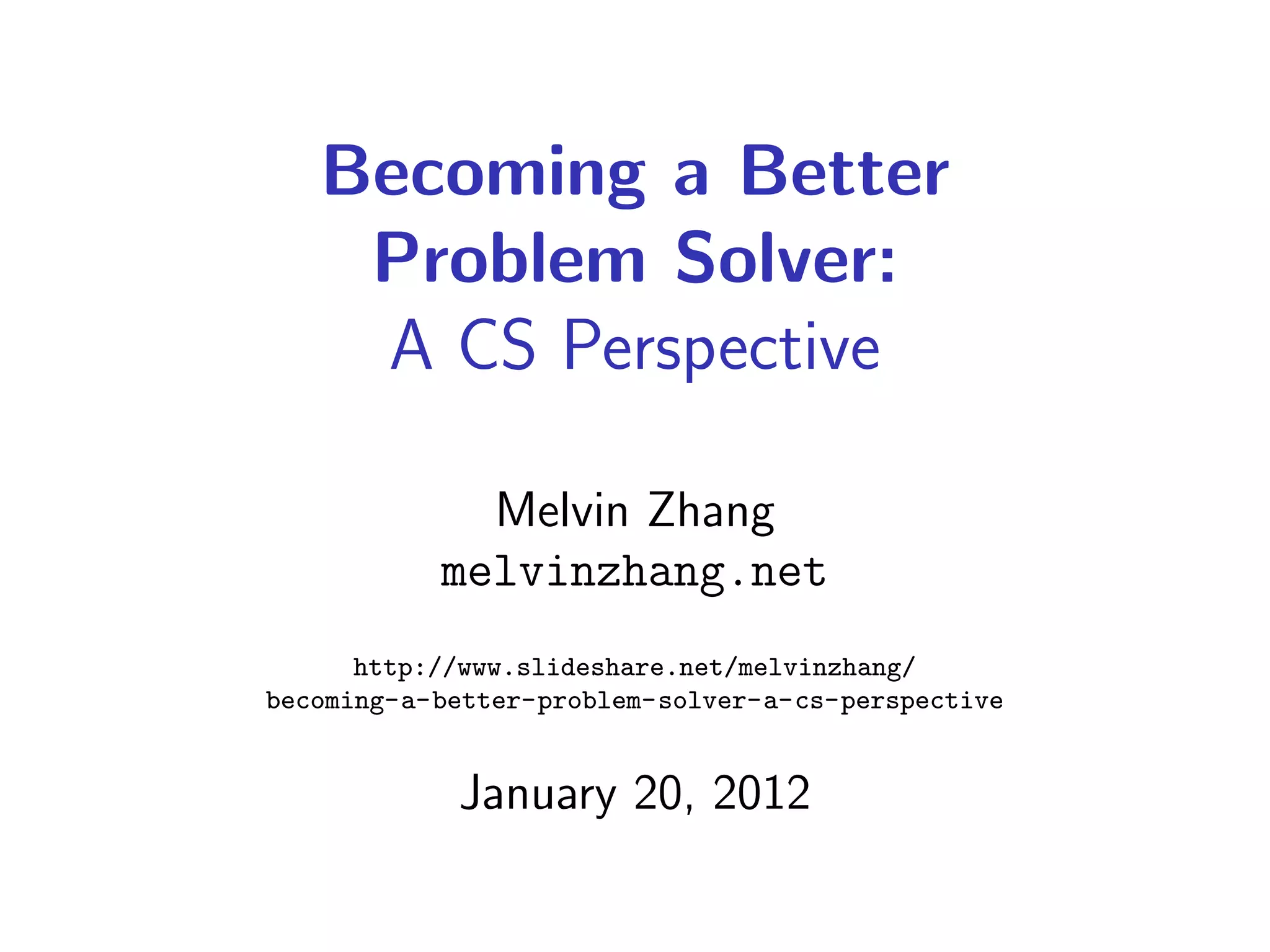 This document discusses strategies and tactics for becoming a better problem solver from a computer science perspective. It begins by defining problem solving and outlining common steps. It then presents strategies for getting started, such as getting hands-on, restating the problem, and using wishful thinking to simplify issues. Tactics for making progress are also outlined, including considering extremes, exploiting symmetries, and trading space for time. Examples are provided to illustrate the approaches. The overall message is that varying attempts, recording progress, and finding easier related problems to solve can help overcome challenges.