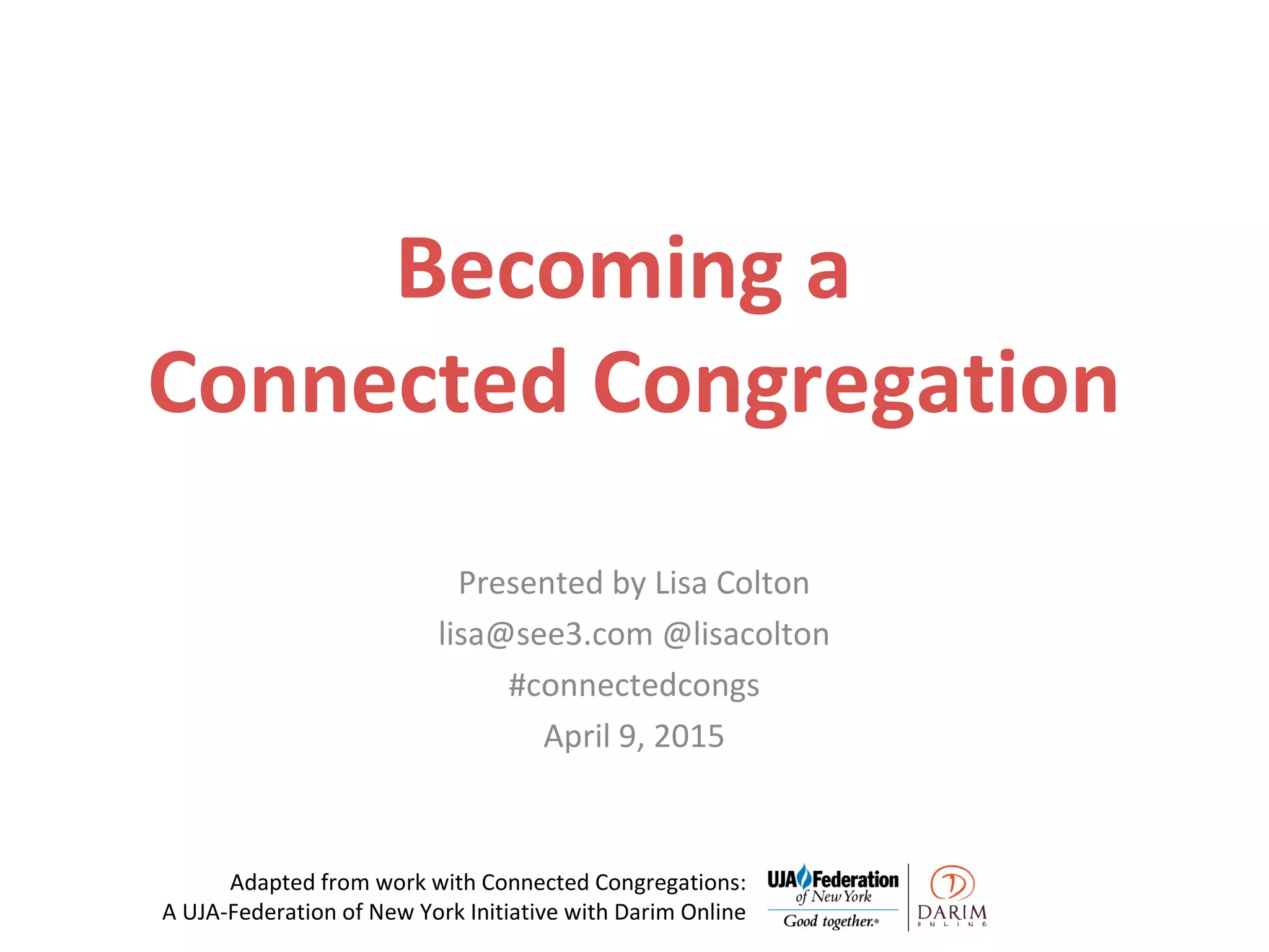 This document provides an overview of becoming a connected congregation. It discusses demographic trends affecting different generations and the characteristics of each. It defines a connected congregation as one that prioritizes relationships, shared values, and aligns all aspects to serve the community. Key lessons include living your organizational values, deeply understanding community and designing for it, building trust through transparency, and being adaptive to challenges through leadership. The presentation emphasizes investing in individual relationships and collective responsibility to strengthen the synagogue community.