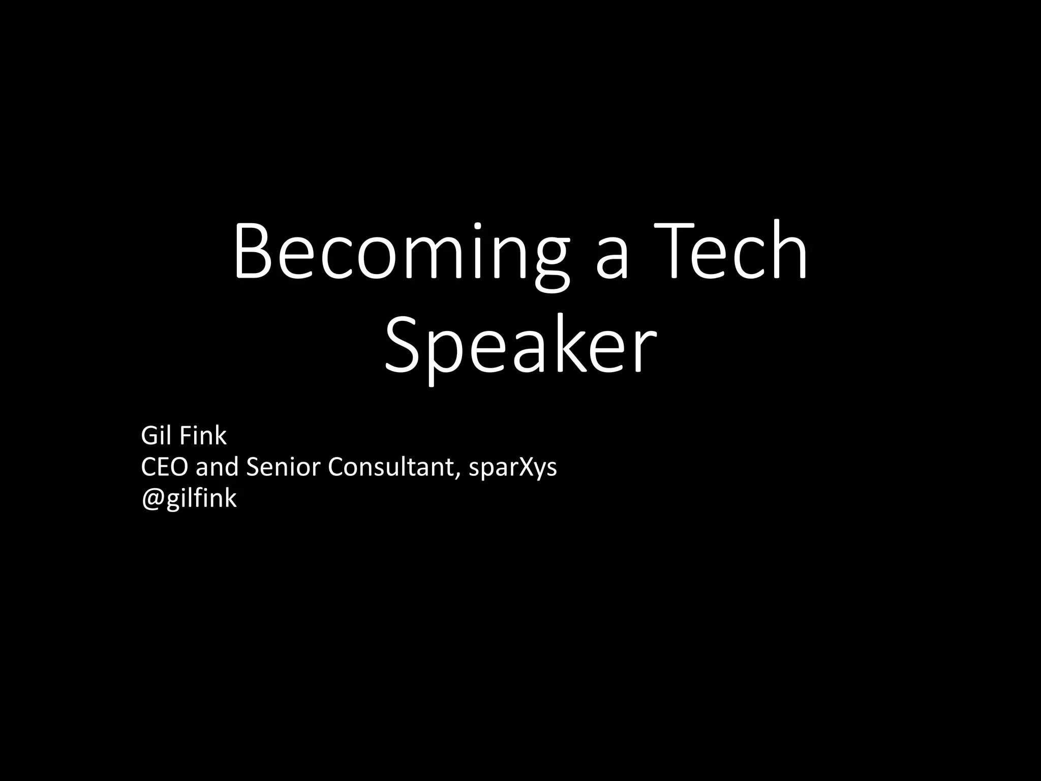 This document provides advice for becoming a tech speaker. It discusses gaining experience by participating in open source projects, writing articles, and answering questions online to build name recognition. Speaking at conferences is recommended to gain experience presenting. When creating a session, the speaker should focus on a clear topic of value to attendees, use prepared demos and coding standards, and practice extensively. Becoming an expert in a niche technology area helps speakers gain recognition and opportunities to present. Overall, the document emphasizes starting small with public contributions and gradually gaining experience speaking before larger audiences.
