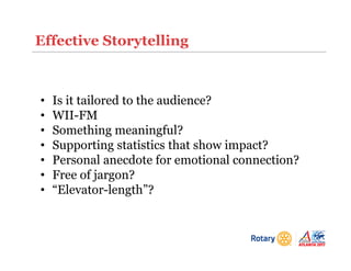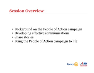 The document outlines a presentation on effective communication strategies for Rotary, focusing on the 'People of Action' campaign aimed at enhancing public understanding of Rotary's impact. It emphasizes the need to share stories, engage community members, and leverage the Rotary brand to foster recognition and action. The creative brief addresses misconceptions, identifies audience segments, and highlights ways for people to engage with Rotary initiatives.