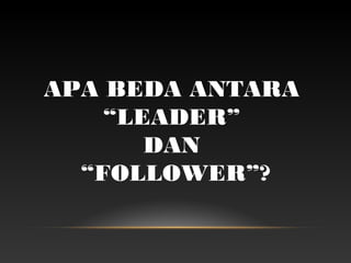 Dokumen tersebut membahas perbedaan antara leader dan follower berdasarkan gaya berpikir mereka, yaitu apakah bersifat reaktif atau proaktif. Model proaktif memiliki lingkaran pengaruh yang lebih besar dan mampu mengendalikan stimulus dari luar untuk memilih respon sesuai nilai-nilai mereka, berbeda dengan model reaktif yang lebih dipengaruhi lingkungan.