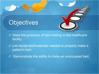 This document outlines the steps for making a patient's bed in a healthcare facility. It lists the objectives of bed making as promoting comfort, ensuring rest, and reducing infection risk. The necessary equipment includes fitted and top sheets, drawsheet, pillowcases, and linen bag. The 8 step procedure demonstrates properly making the bed, including assessing linens, positioning the bed, removing and replacing linens, tucking sheets, and changing pillowcases.