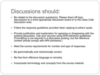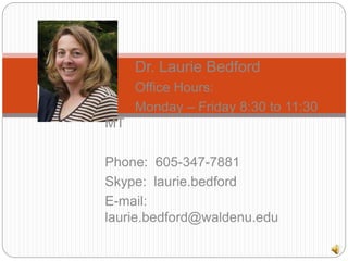 This document provides information about Dr. Laurie Bedford's office hours, contact information, and expectations for discussion posts. Discussions should be related to the question, follow response guidelines, cite sources using APA style as needed, meet course requirements, use proper grammar and avoid offensive language. It also lists scoring rubrics and Walden resources including academic advising, disability services, the library and writing center. The document concludes with Dr. Bedford looking forward to the next eight weeks.