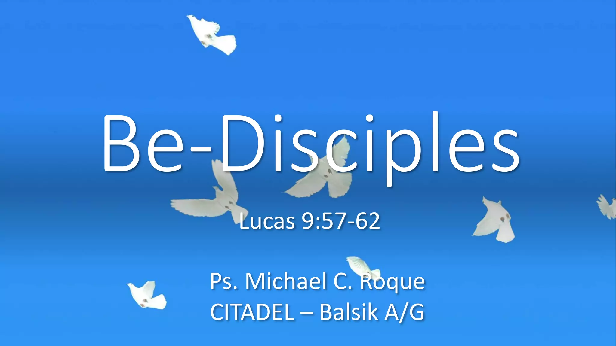 Sa Lucas 9:57-62, itinuturo ni Jesus ang kahulugan ng pagiging disipulo at ang mga hamon na kaakibat nito. Ipinapakita niya na ang tunay na pagsunod ay nangangailangan ng ganap na dedikasyon at pagtanggi sa mga pansamantalang obligasyon. Ipinapaalala ni Jesus na ang sinumang hindi nakatuon sa tungkulin ay hindi karapat-dapat sa kaharian ng Diyos.
