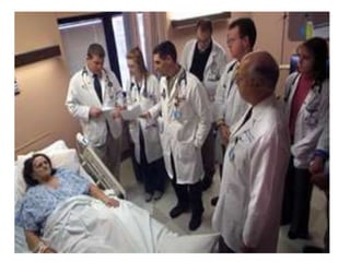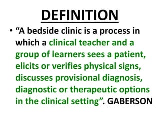A bedside clinic involves a clinical teacher and learners examining a patient together at the bedside to elicit physical signs, discuss diagnoses and treatment plans. It serves several purposes for nursing students, including portraying a patient's nursing problems and care plan, improving care quality, developing students' observation and problem-solving skills. The bedside clinic process involves introduction, discussion, and evaluation phases. It provides advantages like allowing students to extensively prepare for and review clinical practice, but also has disadvantages like potential encumbrance of patients and lack of standardization.