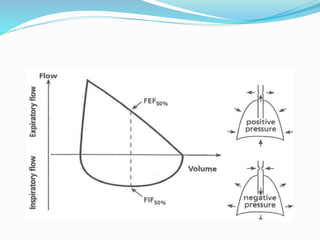 This document discusses pulmonary function tests (PFTs), including their goals, uses, limitations, procedures, and interpretations. PFTs are used to assess lung function before surgeries and characterize any pulmonary dysfunction. Key information obtained from PFTs includes measurements of forced vital capacity (FVC), forced expiratory volume in 1 second (FEV1), their ratio (FEV1/FVC), and peak expiratory flow rate. Interpretations of these values can indicate restrictive or obstructive lung disease. The document outlines how PFTs are performed using portable devices or clinic spirometers and flow-volume loops.