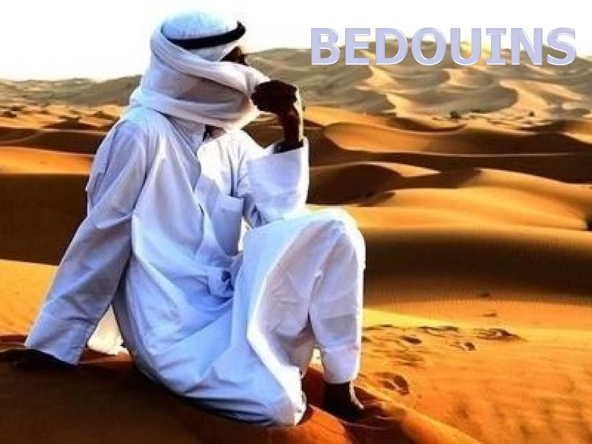 The Bedouins are Arab nomadic peoples who originate from the Arabian Peninsula and roam the deserts of Asia and North Africa. They traditionally engaged in herding livestock and searching for water and pasturelands. While some Bedouins still live a semi-nomadic lifestyle, maintaining their customs and traditions, many have increasingly settled in cities or villages due to factors like drought, oil production, and government policies offering housing, education, and healthcare in exchange for abandoning their nomadic ways. Overall, the Bedouin lifestyle has evolved from a fully nomadic existence to a more semi-nomadic or settled one over time.