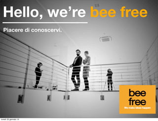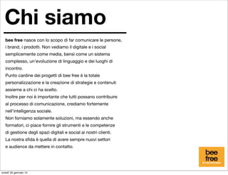 Bee Free è un'agenzia che promuove la comunicazione personalizzata tra persone, brand e prodotti, integrando strategia digitale e social. Sostiene l'importanza dell'intelligenza sociale e si dedica anche alla formazione, offrendo strumenti per gestire gli spazi digitali. La loro filosofia si basa sulla valorizzazione delle qualità uniche delle persone e sulla creazione di contenuti su misura, in un contesto che unisce competenze digitali e passioni analogiche.