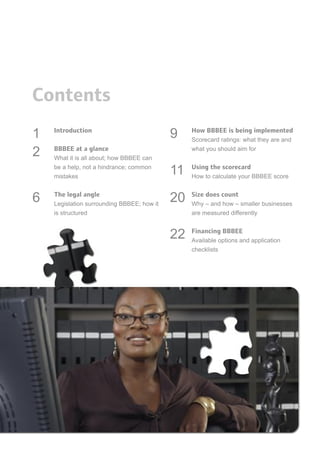 This document provides an overview of Broad-Based Black Economic Empowerment (BBBEE) in South Africa. It explains that BBBEE aims to promote greater black participation in the economy through measures like ownership, employment equity, skills development and preferential procurement. Compliance with BBBEE legislation provides businesses with competitive advantages like improved access to financing and government contracts. While exempted micro-enterprises with under R5 million in revenue are exempt, BBBEE will eventually impact all businesses as government suppliers are required to meet BBBEE targets. The document outlines some common mistakes made in BBBEE implementation and emphasizes that it should be an integral part of a long-term business strategy.