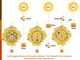 Honey bees live in highly social colonies where members cooperate to gather food, shelter, and protect one another. Their social structure contains three castes - queens, drones, and workers. Queens are the only reproductive females and lay all the eggs. Drones are male bees that fertilize the queen. Workers are sterile females that perform all colony maintenance tasks, from building comb to foraging. Workers progress through indoor and outdoor labor activities over their lifespan, including secreting wax, feeding brood, and collecting nectar. They communicate food sources to each other through round and waggle dances. Honey bees demonstrate an organized division of labor that is essential for colony survival.