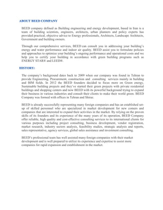 BEED is an engineering and energy development company based in Iran that provides consulting services related to building energy performance, indoor air quality, green building certification, and sustainable building projects. It was founded in 2009 and has offices in Tehran and Shiraz. BEED assists international clients with market development, business consulting, and project consulting. It has expertise in areas like energy auditing, energy modeling, green building certification, HVAC, renewable energy, green walls, roof gardens, and landscaping.