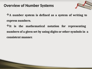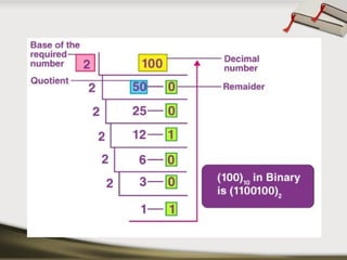 The document provides an overview of various number systems used in digital electronics, including binary, decimal, octal, and hexadecimal systems. It discusses conversion techniques between these systems, encoding methods like Binary Coded Decimal (BCD) and Gray code, and introduces basic logic gates and their functions. Additionally, it covers combinational circuits, sequential circuits, and the types of flip-flops used in electronic systems.