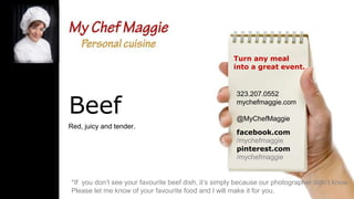 The document promotes various beef dishes and invites customers to turn their meals into great events. It provides a contact number and social media links for Chef Maggie, emphasizing a willingness to create custom dishes based on customer favorites. The focus is on quality beef options such as sirloin, brisket, and osso buco.