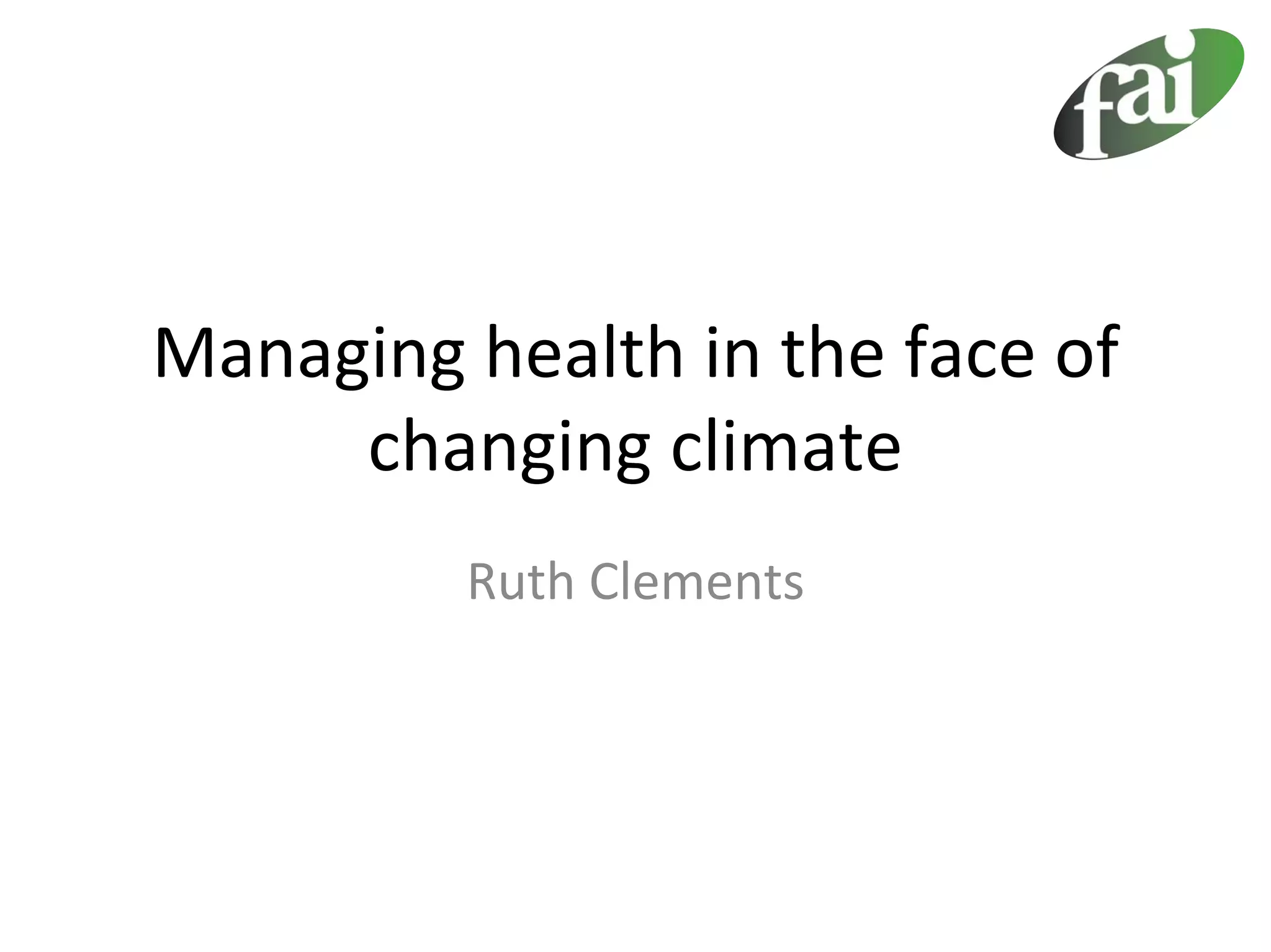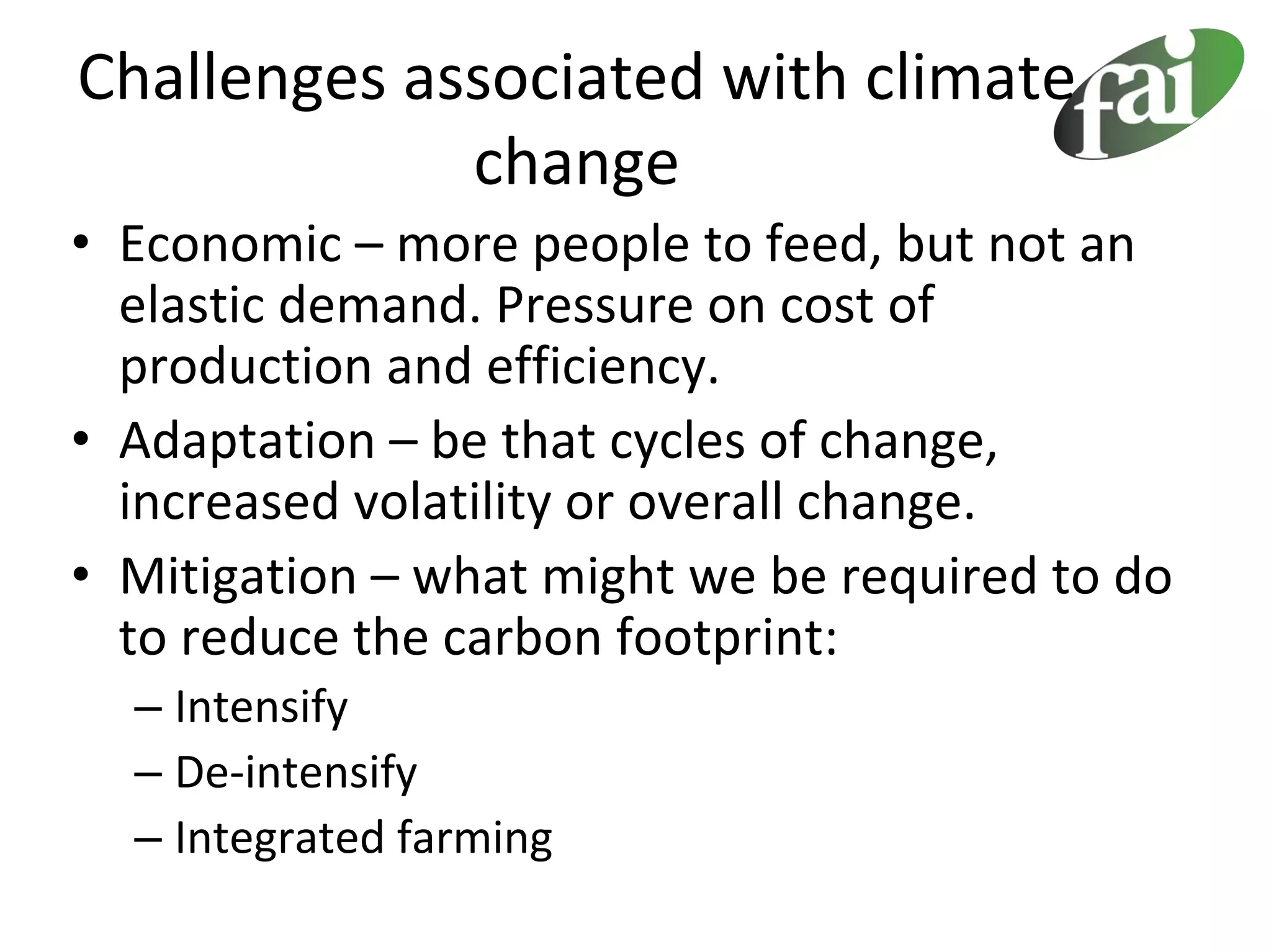 The document discusses the challenges of managing animal health amid climate change, focusing on economic pressures, adaptation strategies, and the impact of changing climate on sheep production costs. It emphasizes the importance of quantifying current health situations, modifying husbandry methods, and implementing targeted health plans to address issues such as lameness and liver fluke. Future planning and partnerships with veterinary professionals are highlighted as essential for effective disease management.