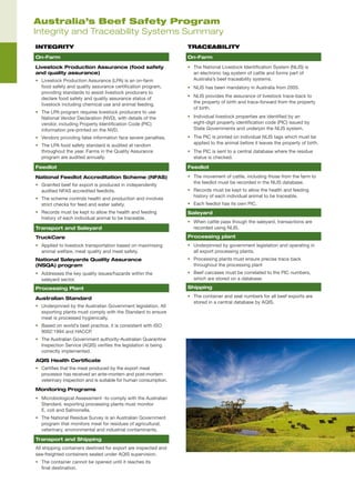 The document summarizes Australia's beef safety program which has strict integrity and traceability systems from farm to processing plant. It outlines the Livestock Production Assurance program which certifies on-farm food safety and quality standards. Cattle are identified and tracked using electronic tags as part of the National Livestock Identification System. Feedlots are accredited under the National Feedlot Accreditation Scheme to control health and ensure traceability. The systems aim to assure trading partners of Australia's high food safety standards for beef from farm to plate.