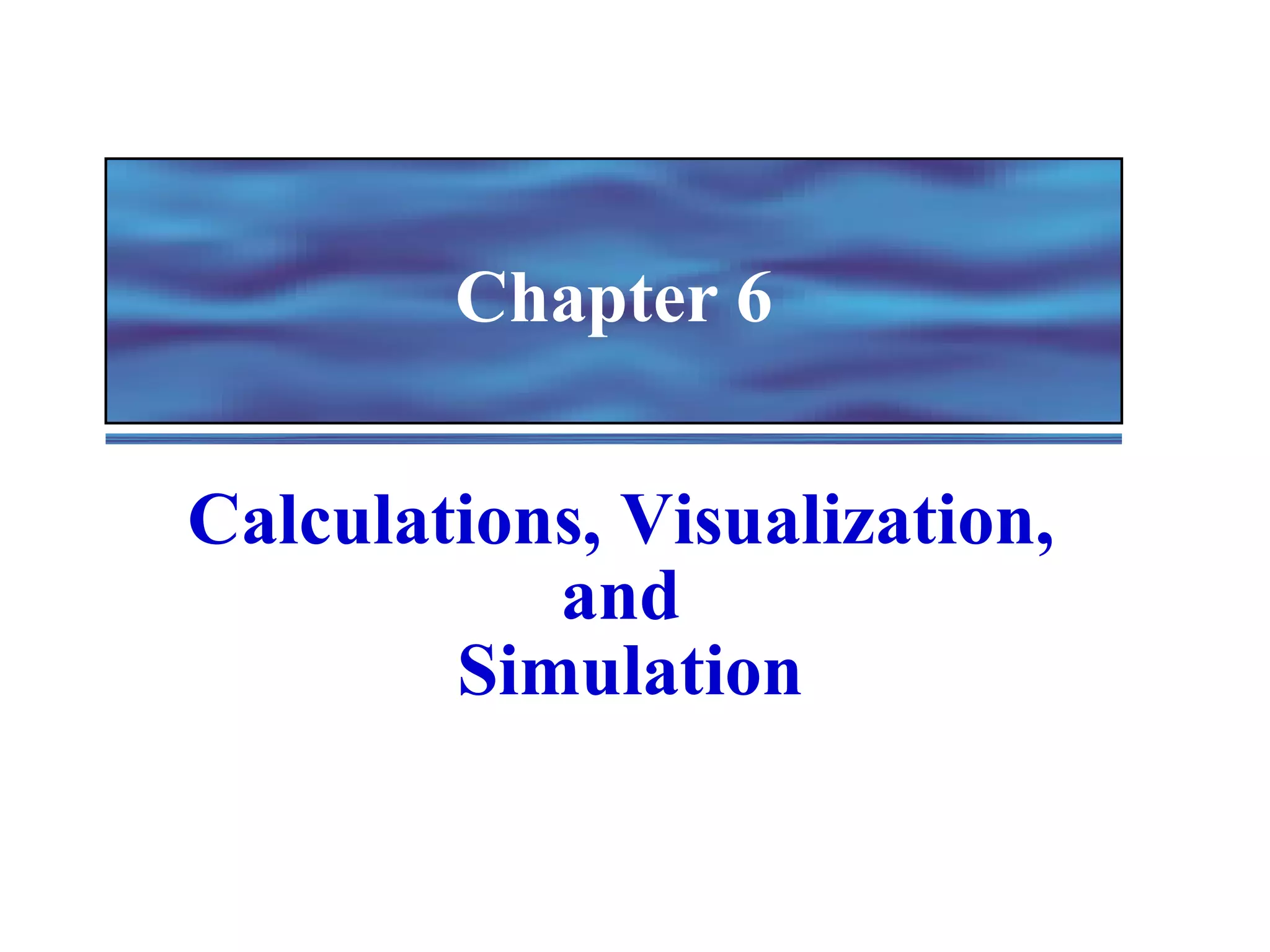 Spreadsheets allow users to enter values and formulas to perform calculations and visualize data. Formulas can be relative or absolute and automatically update when values change. Spreadsheets include functions, macros, templates, linking, and database capabilities. Statistical and visualization software extend spreadsheet capabilities to analyze data, test relationships, and create models and simulations. Computer modeling and simulation are used for research, training, and assessing risks by creating abstract representations of systems.