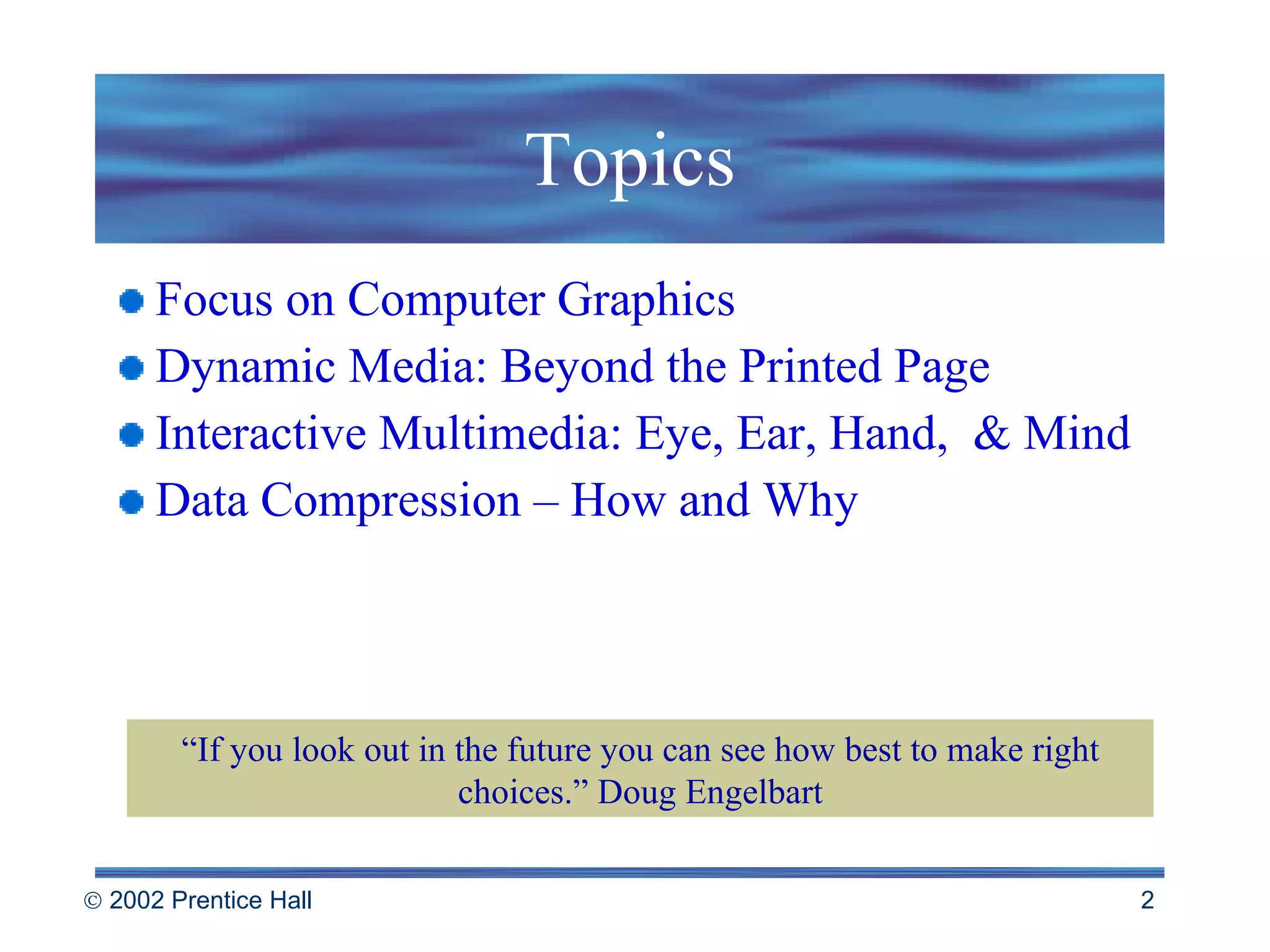 The document discusses various topics related to computer graphics, dynamic media, and multimedia. It covers painting software, digital image processing, drawing software, 3D modeling software, CAD/CAM software, presentation graphics, animation, desktop video, audio, hypertext, hypermedia, and interactive multimedia. It provides examples and guidelines for creating graphics, presentations, animation, and interactive multimedia content.