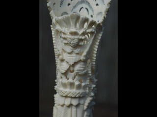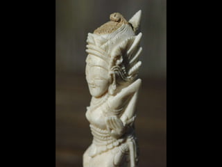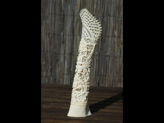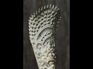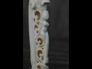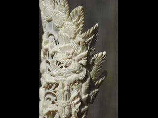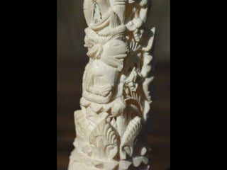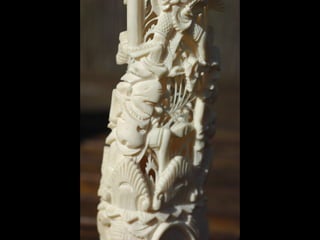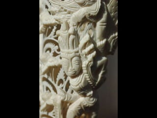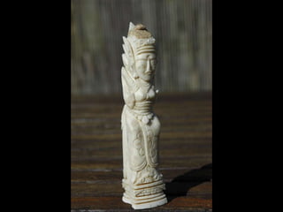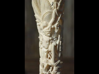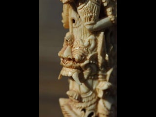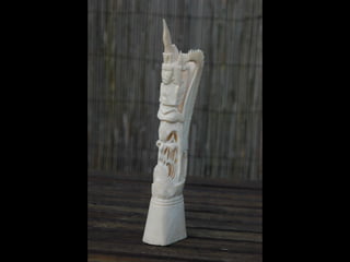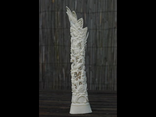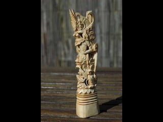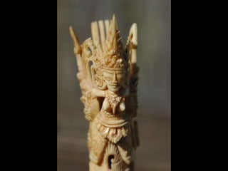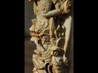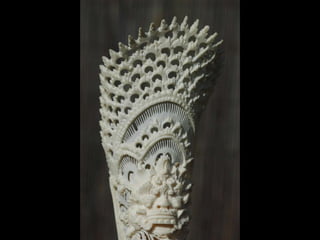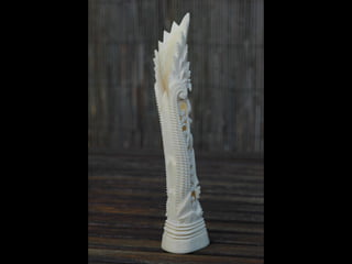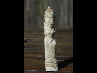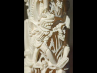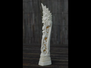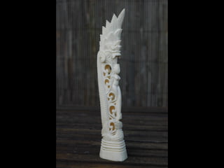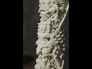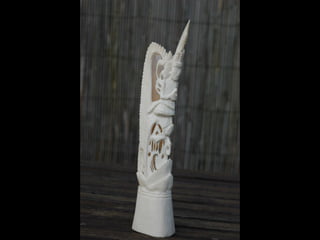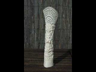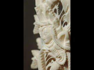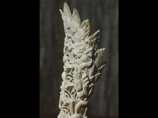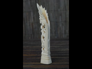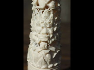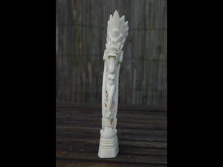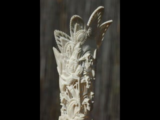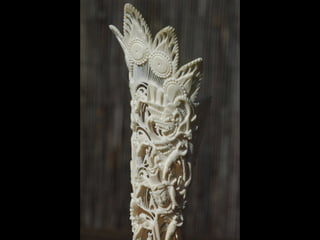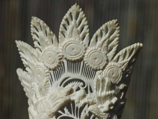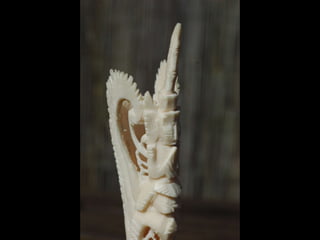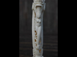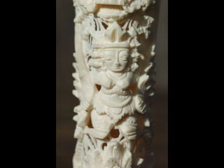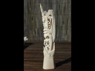 Een impressie van bijzonder fraai en fijn gesneden been. Het grootste beeld is niet meer dan 25 cm. hoog Het snijwerk is fabelachtig gedetailleerd en fijn. Afkomstig uit Indonesie en niet te verwarren met het beschermde olifanten-ivoor.