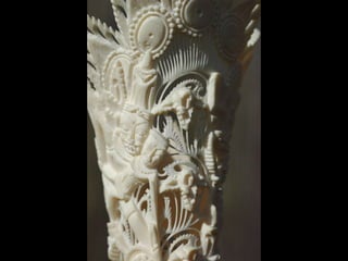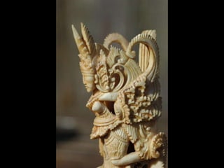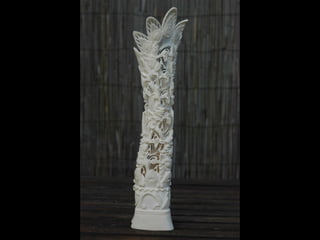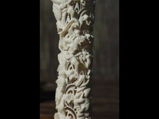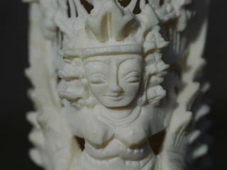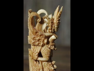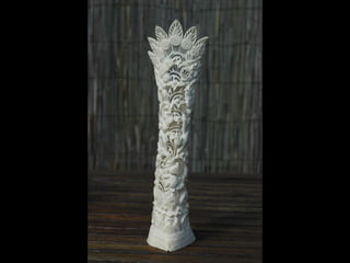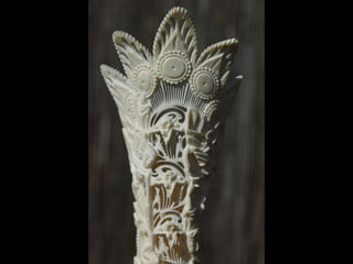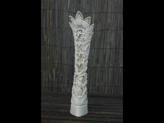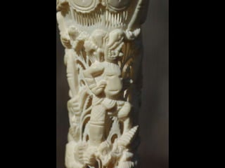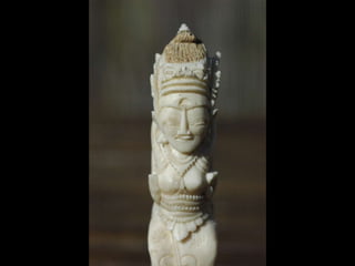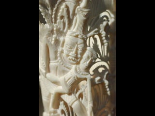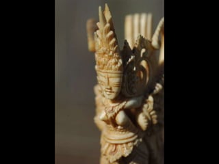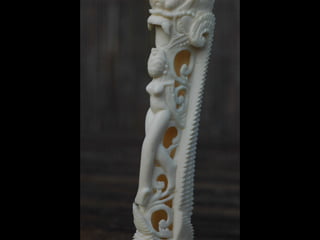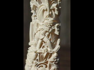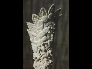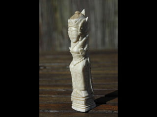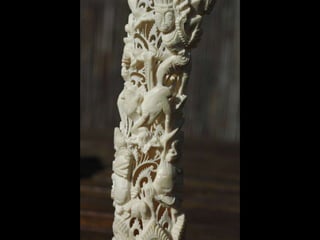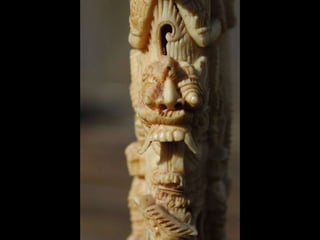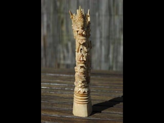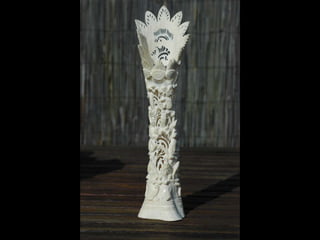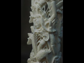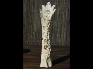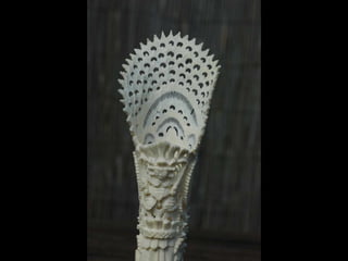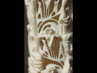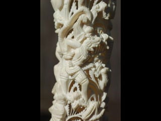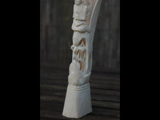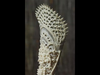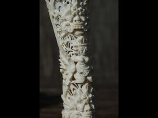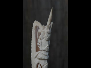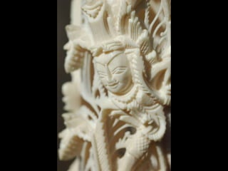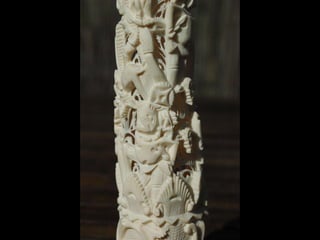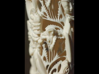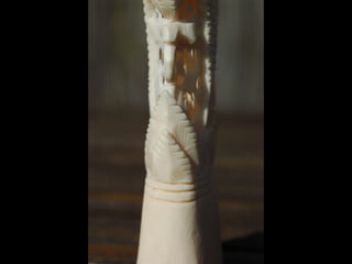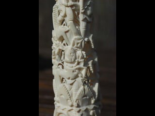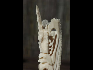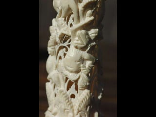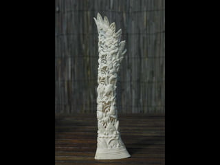 Een impressie van bijzonder fraai en fijn gesneden been. Het grootste beeld is niet meer dan 25 cm. hoog Het snijwerk is fabelachtig gedetailleerd en fijn. Afkomstig uit Indonesie en niet te verwarren met het beschermde olifanten-ivoor.