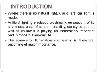 This document provides an overview of electrical power utilization and lighting. It discusses the nature of light and how different light sources work, including incandescent lamps, arc lamps, and discharge lamps like fluorescent lamps. Key terms related to illumination such as luminous flux, luminance, inverse square law, and Lambert's cosine law are defined. The document also describes the construction and properties of common light sources like incandescent lamps, arc lamps, and high-pressure mercury vapor lamps.