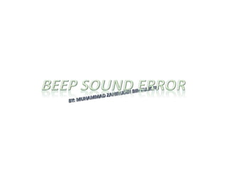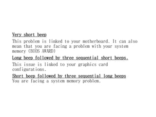This document describes various beep codes and the computer hardware issues they indicate. A very short beep can mean a motherboard or BIOS problem. A long beep followed by three short beeps relates to graphics card configuration. A short beep followed by three long beeps indicates a system memory problem.