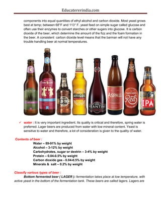 The document provides a comprehensive overview of beer, detailing its ingredients, types, manufacturing process, and various global varieties. Beer is primarily made from barley, hops, yeast, and water, with different fermentation methods producing lagers and ales. It also highlights historical brewing practices and the cultural significance of beer across different regions.
