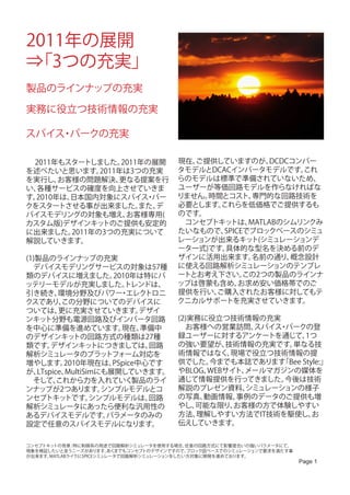 ま た、2011年3月までにWEBサイトのリニューア ルを計画しております。 こちらも楽しみにしてく ださい。 また、 従来どおり、市場調査及びお客様 の声から得られたテーマ性のある技術的内容 は従来どおり、 セミナー及びワークショップの 場を通じて、 お伝えしていきます。特にワークシ ョップは体験型ですので、 イメージがつかみや すくなると思います。 (3)スパイス パークの充実 ・ 2010年に日本国内対象にスパイス パーク ・ のサービスをスタートしました。 2010年12月 Fig.1 slideshareのサイト 31日現在で3,585個のスパイスモデルを配信 しております。 現在はPSpiceモデル中心です が、 LTspiceモデル版も順次、 アップデートし ていきます。 スパイスモデルのネッ トリストは SPICE系シミュレータであれば殆ど活用出来ま すが、 回路図シンボルだけはそれぞれのツー ル依存性がありますので、 PSpice用回路図シン ボルデータ(.olb)ファイルをLTspiceにもってい ってもLTspice側で読み込んでくれません。 また その逆も同様です。 回路図シンボル作成のオペ レーションは容易な内容ですが、 工数だけが非 常にかかる単純作業です。 各ツールにあわせ た回路図シンボル作成も代行しますので、 お問 い合わせ下さい。 2011年は現在のスパイス パークをグロー ・ Fig.2 Youtubeのサイト バル版にし、 世界市場に向け展開し、 更にモデ ルのコンテンツ量を増やしていきます。 グロー バル版の場合、 米国エリア、 欧州エリア、 韓国、 その1つの情報伝達手段として、 Fig.1のslide- 台湾、 インド、 それぞれのエリアにてニーズの shareのサイト(http://www.slideshare.net/ 高いデバイスを対象にスパイスモデルを充実 TsuyoshiHorigome)とFig.2のYoutubeのサイ させていきます。 ト(http://www.youtube.com/user/beetech) があります。 slideshareのサイトでは2011年1 月9日現在でプレゼンテーション資料を46タイ トル、 ドキュメントを16タイトルご提供しており ます。 参照及びダウンロードが出来るサービス です。 Youtubeサイトでは、 シミュレーションの 動作動画を多く提供し、 使用感、 解析精度を動 画で参照して頂く機会を増やしていきます。 ま た、 スパイス パーク内にも情報を集約し、 ・ ここ にくれば、 必要な情報が入手出来、 問題解決に も役立つ情報提供の場を形成していきます。 ま た、 ソーシャルネッ トワークも活用し、 試行錯誤 情報の伝達の手段として、文章、 写真、 動画があります。順番に情報量が多くなります。ここ数年で写真、動画関連の情報技術が飛躍的に向上し、 更に、利便性も良くなりました。2010年はソーシャルネッ トワークも先進国、発展途上国の区別なく、普及しております。2011年は更に普及してい くと予測できます。特に海外展開に対して、 このメディアをいかに活用し、サービスを向上させるか。模索する2011年になりそうです。 Page 2