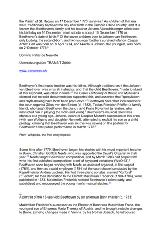 Ludwig van Beethoven was a German composer and pianist born in 1770 in Bonn, Germany. He was an influential figure in transitioning music from the Classical era to the Romantic era. Some of his most famous works include 9 symphonies, 5 piano concertos, 32 piano sonatas, and 16 string quartets. He studied music from a young age in Bonn and later moved to Vienna in 1792 to further his studies under Joseph Haydn. In Vienna, he established himself as a renowned pianist and composer despite gradually losing his hearing later in life.