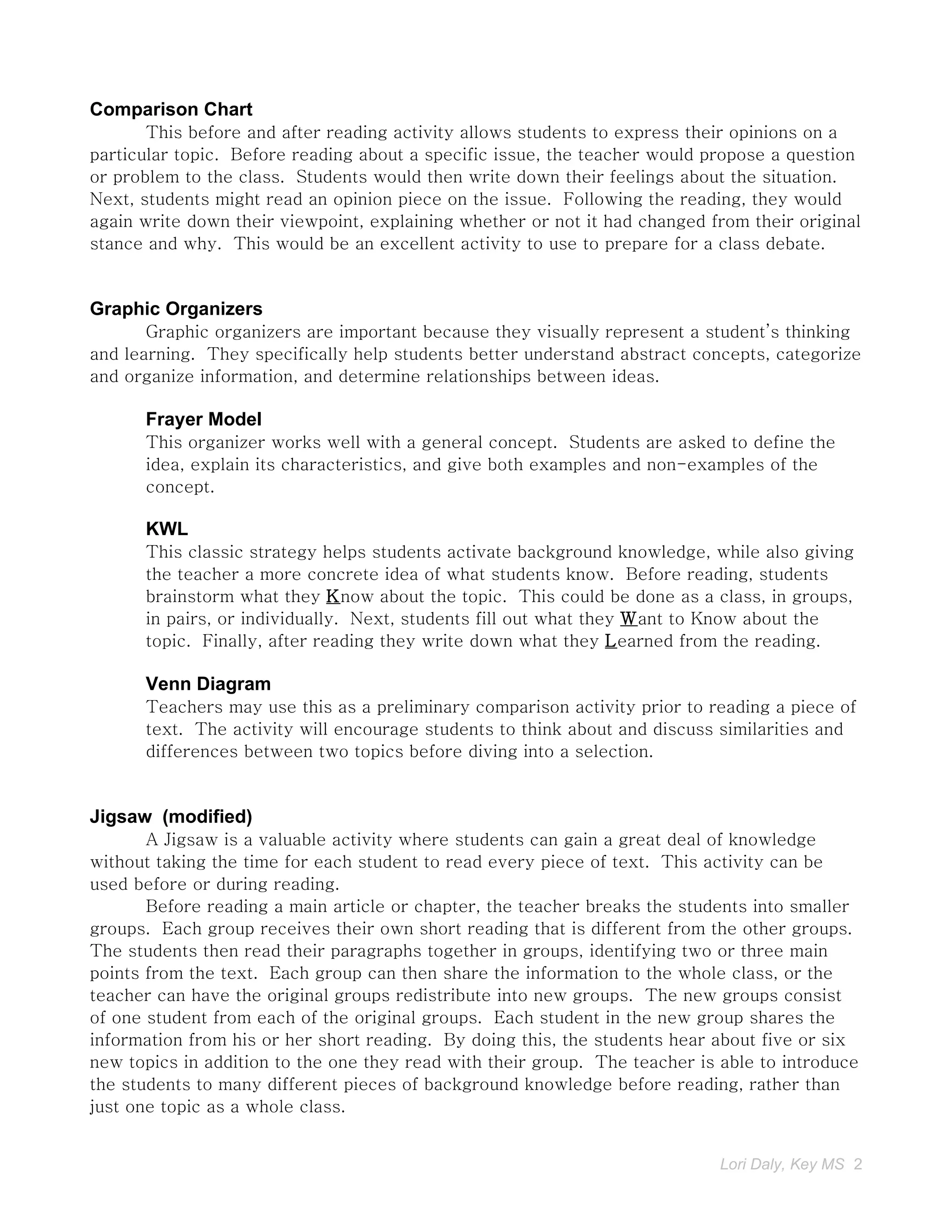The document describes several strategies that teachers can use before reading to help students activate background knowledge and build interest in an upcoming text. These include graphic organizers like KWL charts, anticipation guides, jigsaws, and activities using key vocabulary words like possible sentences, questions, and word splashes to make predictions. Other strategies are quote analysis, video previews, problematic situations, and previewing text features to develop questions for reading. The purpose is to engage students and give them purpose and context for reading.